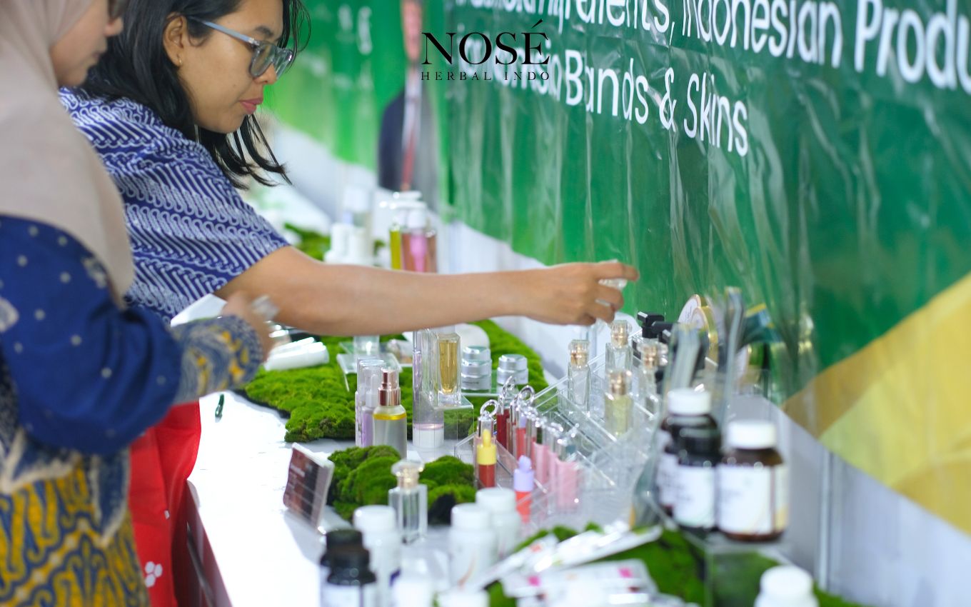 Selain aktivitas riset, Nosé juga menampilkan contoh formulasi produk kosmetik yang masih dapat dikembangkan lebih lanjut serta produk obat tradisional yang telah diproduksi. Rangkaian pengalaman ini ditutup dengan pembagian sampel parfum gratis kepada pengunjung, yang semakin memperkuat kesan booth sebagai ruang edukasi dan kolaborasi yang terbuka, interaktif, dan relevan dengan kebutuhan industri.