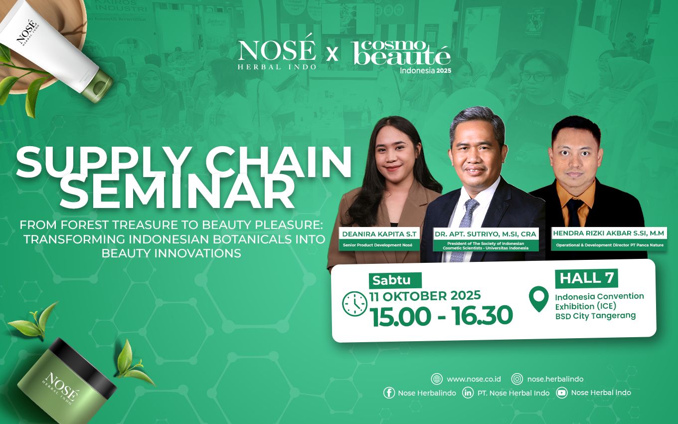 Seminar ini menghadirkan tiga pembicara inspiratif, Hendra Rizki Akbar (Operational & Development Director PT Panca Nature), Dr. Apt. Sutriyo, M.Si. (Universitas Indonesia, President of The Society of Indonesian Cosmetic Scientists), serta Deanira Kapita (Senior Product Development Nosé). Mereka akan membagikan wawasan seputar riset botanikal, pengembangan bahan baku alami hingga transformasinya menjadi produk kecantikan modern.